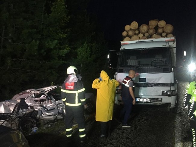 KARABÜK’ün Safranbolu ilçesine bağlı Ovacuma köyünde tomruk yüklü kamyon ile otomobil çarpıştı. Kazada 2 kişi hayatını kaybederken, 1’i ağır 2 kişi yaralandı.