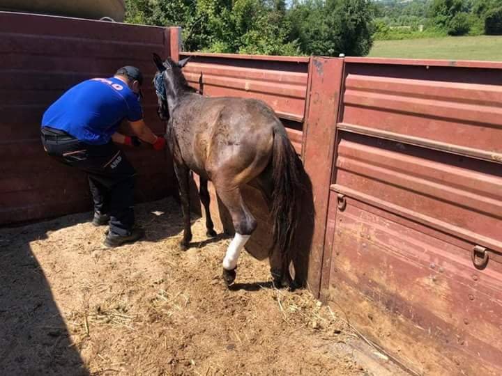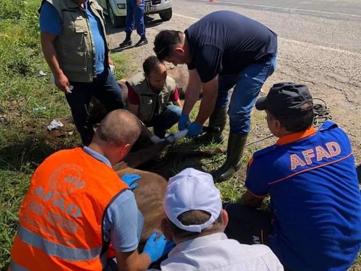 Veteriner Tolga Kandıralı, at ile 8 aylık tayın sol ayaklarını yolda tedavi etti. Yaralı at ile yavrusu olduğu düşünülen tay, fileyle bağlanan kepçe ile kaldırılarak, kamyona koyuldu. At ve tay, kamyonla bakımlarının yapılması için Zonguldak Gökçebey Hayvanat Bahçesi’ne götürüldü.