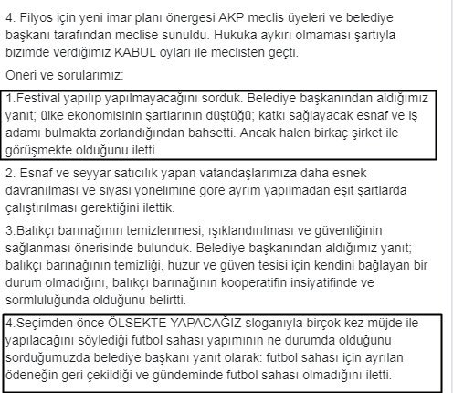 Zonguldak’ın Çaycuma ilçesine bağlı Filyos beldesinin Ak Partili Belediye Başkanı Ömer Ünal geçtiğimiz sene yaptığı festival programında Filyos’un olmazsa olmazı olan futbol sahasının yapılması konusunda müjdesini vermişti. Ancak 1 Temmuz 2019 tarihinde yapılan Belediye Meclis Toplantısında futbol sahası için ayrılan ödeneğin geri çekildiği iddia edildi.