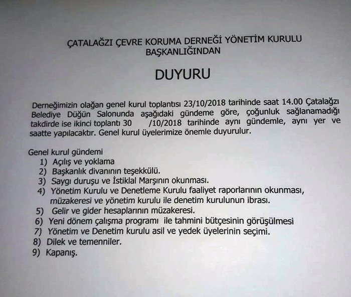 “Derneğimizin olağan genel kurul toplantısı 23/10/2018 tarihinde saat 14:00’de Çatalağzı Düğün Salonunda aşağıdaki gündeme göre, çoğunluk sağlanamadığı takdirde ise ikinci 30/10/2018 tarihinde aynı gündemle, aynı yer ve saatte yapılacaktır. Genel kurul üyelerimize önemle duyurulur.