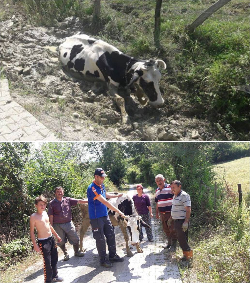 Olayın yaşandığı Çayır Köyüne ulaşan AFAD ekipleri yaklaşık 1 saatlik çalışmanın ardından ineği saplandığı çamurdan çıkararak sahiplerine teslim etti. (Bartın TV)