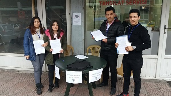 Çatalağzı Belediyesi Gençlik Meclisi öncülüğünde Meclis Başkanı Mert Çakır, Ramazan Kartal, Melisa Bulut, Merve Fidan, Livanur Velioğlu, Vildan Güneş, Seray Çetin, Tuana Acar, Derya Acar, Deniz Gençtürk, Berk Cebeci, Murat Eyi,Cem Baran, Mertcan Palabaş ve Rümeysa Sarı isimli gençler Çatalağzı Çevre Koruma Derneği ile Çatalağzı Engelliler Derneği’nin destekleri tarafından beldede her Salı günleri kurulan halk pazarında vatandaşlara “Cumhurbaşkanlığı” makamına gönderilmek üzere belde de yeni bir santral kurulmaması için imza kampanyası tüm hızıyla devam ediyor. Belde de kurulan stantta yaklaşık 400 imza toplandı.