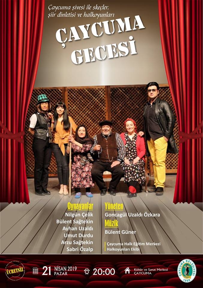 Çaycuma Kültür ve Sanat Merkezinde 21 Nisan 2019 Pazar günü akşamı saat 20.00’de Çaycuma şivesine özgü “Çaycuma Gecesi” isimli tiyatro gösterisi sunulacak. Tiyatronun yönetmenliğini Goncagül Uzaldı Özkara üstlenirken, Nilgün Çelik, Bülent Sağtekin, Ayhan Uzaldı, Umut Durdu, Arzu Sağtekin ve Sabri Özalp ise oyuncu olarak katılacak.
