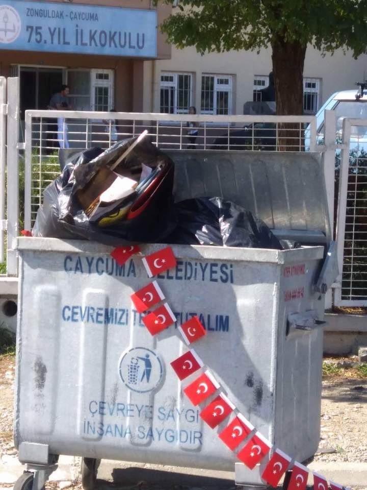 Zonguldak’ın Çaycuma ilçesinde 75. Yıl İlkokulu yakınlarında olan çöp konteynerına kimliği belirsiz kişi veya kişilerce Türk bayrağı atıldı.