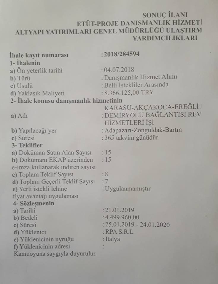 Bartın da da açıkladığı en önemli projeden biride yıllardır konuşulan ama bir türlü gerçekleşemeyen Adapazarı Bartın Tren hattı idi. Alınan bilgilere göre Adapazarı-Bartın Tren hattına ait işin 4 Temmuz 2018 de ihalesi yapılan 1/25.000 ölçekli haritasının yapılması ve Kadastral Kamulaştırma ile ilgili proje çalışmaları için ihaleyi alan dünya çapında RPA.SRL olan İtalyan firmasına yer teslimi yapıldığı ve hemen çalışmaya başlandığı yaklaşık 500 metre genişliğindeki Tren yolu güzergahı projesi 1 yılda biteceği (24.01.2020’de), kamulaştırmalar bittikten sonra inşaat çalışmaları başlanacağı belirtildi.