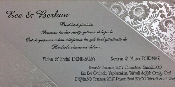 Öte yandan 29 Temmuz Cumartesi günü Karşıköy Mahallesi Sağlık Ocağı önünde kız kınası yapılacak ve ardından ertesi günü Türkali Sahil Plajında düğün merasimi yapılacak. Ece ve Berkan Durmaz çifti yaptırdıkları düğün davetiyesinde; “Birlikteliğimizin sonsuza kadar sürüp gitmesi dileği ile ortak yaşama adım attığımız bu çok özel günümüzde bizlerle olmanızı dileriz” dediler. (Haber Merkezi)