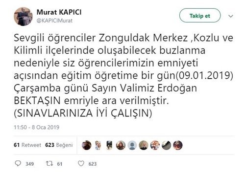 İl Milli Eğitim Müdür Vekili Murat Kapıcı, 9 Ocak 2019 günü de eğitime bir gün ara verildiğini açıkladı. Zonguldak merkez ilçe, Kilimli, Kozlu ilçelerinin yanı sıra Alaplı ve Devrek ilçelerinde de eğitime 9 Ocak 2019 günü ara verildiğini açıkladı. Kapıcı, “Sevgili öğrenciler Zonguldak Merkez,Kozlu ve Kilimli ilçelerinde oluşabilecek buzlanma nedeniyle siz öğrencilerimizin emniyeti açısından eğitim öğretime Çarşamba günü Valimiz Erdoğan Bektaş’ın emriyle ara verilmiştir. Sınavlarınıza iyi çalışın” açıklamasında bulundu. (İHA)