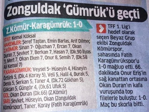 Spor Toto 2. Lig Beyaz grupta mücadele eden temsilcimiz Zonguldakspor’un kendi saha ve seyircisi önünde Karagümrükspor’u 1-0 yendiği maçın haberi, ulusal yayın yapan Fanatik spor gazetesi tarafından ‘Zonguldak Gümrük’ü Geçti’ başlığıyla verildi…