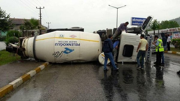 Zonguldak’ın Devrek ilçesine bağlı Çaydeğirmeni beldesi Ankara karayolu üzerinde kontrolden çıkan beton mikseri yolda devrildi. Kazada şans eseri kimseye birşey olmadı.