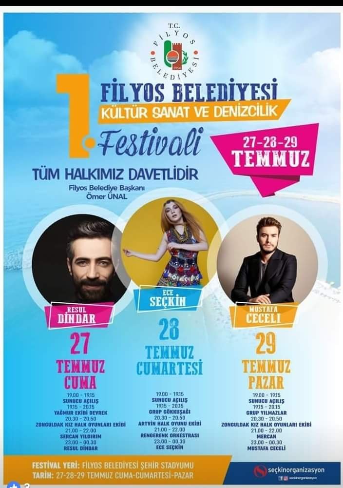 27-28-29 Temmuz’da Filyos Şehir Stadyumunda gercekleştirilecek olan festivalde ünlü sanatçılardan Resul Dindar, Ece Seçkin ve Mustafa Ceceli sahne alacak.