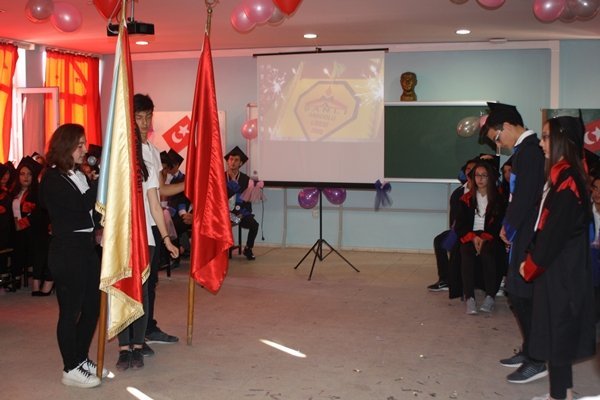 Tören ilk olarak bir dakikalık saygı duruşu ve İstiklal Marşı’nın okunmasıyla başladı. Melek-Ahmet Şanlı Anadolu Lisesi Müdürü İsmail Ertop törenin açılış konuşmasını yaparak törene gelen davetlilere, velilere teşekkür etti. Ertop ayrıca okuldan mezun olan 53 öğrenciye ileriki hayatlarında başarılar temennisinde bulundu. Okul birincisi Kübra Nur Demir ve Kubilay Kesici ise konuşma yaparak duygu ve düşüncelerini aktardı. Daha sonra bayrak ve flama devir teslimi yapıldı.