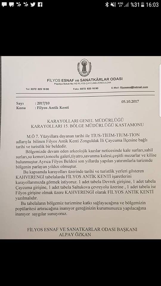 Filyos Esnaf ve Sanatkarlar Odası Başkanı Alpay Özkan Filyos’un turizm açısından en önemli yapıya sahip olan Antik Kentin belirli yerlere tabela konulması için Karayollarına yazdığı yazı olumlu bulunarak Devrek ve Saltukova girişine Antik Kent tabelası yerleştirildi.