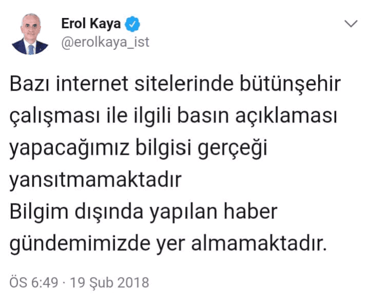 Bazı internet haber sitelerinde yayımlanan “Bütünşehir” haberleri Ak Parti Genel Başkan Yardımcısı Erol Kaya tarafından yalanlandı.