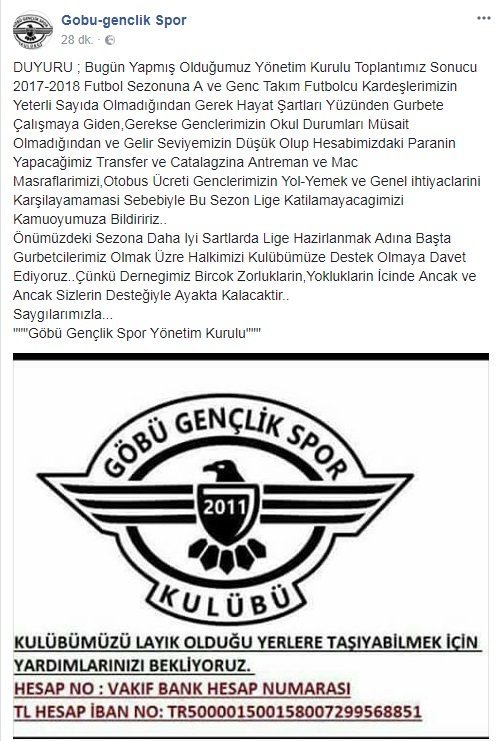 Kulüp Başkanlığı tarafından yapılan açıklamada; “Bugün Yapmış Olduğumuz Yönetim Kurulu Toplantımız Sonucu 2017-2018 Futbol Sezonuna A ve Genç takım futbolcu kardeşlerimizin yeterli sayıda olmadığından gerek hayat şartları yüzünden gurbete çalışmaya giden, gerekse gençlerimizin okul durumları müsait olmadığından ve gelir seviyemizin düşük olup hesabımızdaki paranın yapacağimiz transfer ve Çatalağzı’na antreman ve maç masraflarımızı, otobüs ücreti gençlerimizin yol-yemek ve genel ihtiyaçlarını karşılayamaması sebebiyle bu sezon lige katılamayacağımızı kamuoyumuza bildiririz. Önümüzdeki sezona daha iyi şartlarda lige hazırlanmak adına başta gurbetçilerimiz olmak üzere halkımızı kulübümüze destek olmaya davet ediyoruz. Çünkü dernegimiz birçok zorlukların, yoklukların içinde ancak ve ancak sizlerin desteğiyle ayakta kalacaktır. Saygılarımızla…” denildi. (Spor Servisi)