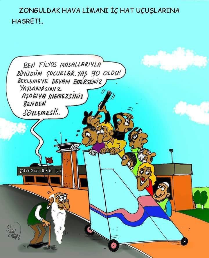 Zonguldaklı ünlü karikatürist Şerif Cihan Çaycuma ilçesine bağlı Saltukova beldesinde bulunan havalimanın gelmeyen ve bir türlü başlatılamayan iç hat seferlerini çizdi;