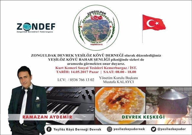 Zonguldak Devrek Yeşilöz Köyü Derneği tarafından İstanbul’un Kemerburgaz ilçesine bağlı Kurt Kemeri Sosyal Tesislerinde 14 Mayıs Pazar günü sabah 08.00 ile 18.00 saatleri arasında Bahar Şenliği adı altında piknik etkinliği düzenlenecek. Düzenlenecek olan piknik etkinliğinde Gökçebeyli Sanatçı Ramazan Aydemir sahne alacak. Ayrıca katılımcılara ikram olarak Devrek Keşkeği verilecek.