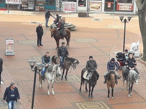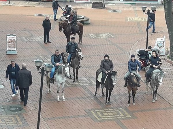 Zonguldak’ın Çaycuma ilçesinde Cumhuriyet Meydanına at üzerinde gelen 6 kişi renkli görüntülere sahne oldu.