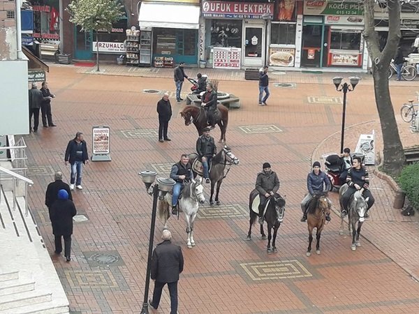 Televizyonlarda kovboy filmlerini andıran sahne gibi Cumhuriyet Meydanını gezen atlı vatandaşlar burada at üzerinde gezinti yaptı.