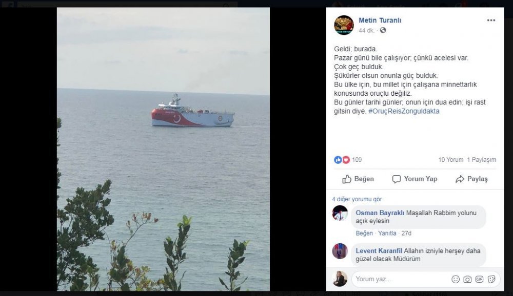 Zonguldak İl Emniyet Müdürü Ahmet Metin Turanlı,  sosyal medya hesabından Oruç Reis Gemisinin fotoğrafını paylaşarak Pazar günü bile  çalıştığını ve acelesi olduğunu ifade etti.  Turanlı, herkes den Oruç Reis için dua istedi.