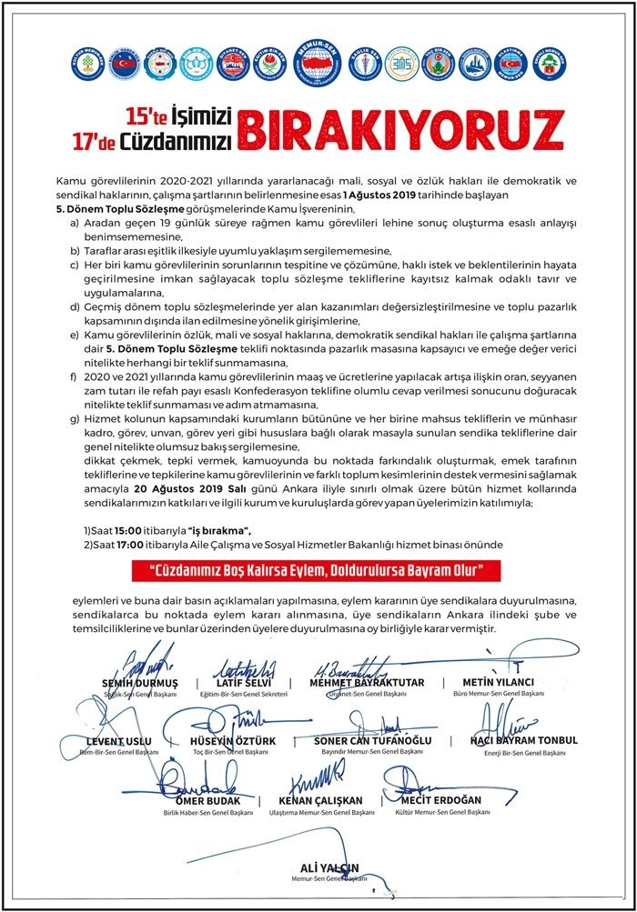 Gece saatlerinde başlayan ve sabahın erken saatlerine kadar devam eden Başkanlar Kurulu toplantısında iş bırakma kararı çıktı. İl temsilcileri toplantısı, başkanlar kurulu toplantısı ve genişletilmiş başkanlar kurulu toplantısı sonucu çıkan karar göre; Memur-Sen bugün saat 15’te iş bırakma eylemi, saat 17’de ise bakanlık önünde cüzdan bırakma eylemi gerçekleştirecek. Memur-Sen Başkanlar Kurulu’nun 7 maddelik kararında iş bırakma eylemi ve cüzdan bırakma eyleminin gerekçelerine yer verildi. (Haber Merkezi)