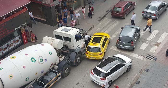 Gazipaşa caddesinde beton mikseri kör noktasında kalan taksiye yandan çarptı. 67 DA 114 plakalı mikserin 67 T 0178 plakalı taksiye çarpması ile trafik tek şeride düştü. Hızlı bir şekilde olay yerine gelen polis trafiği tekrar açtı.