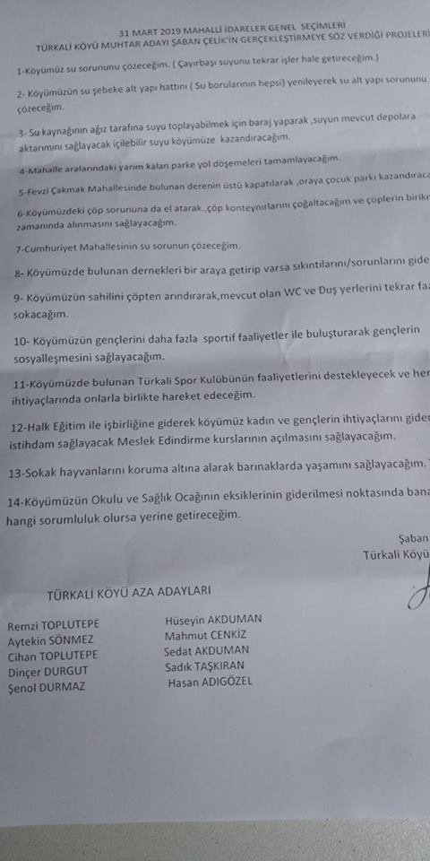 Zonguldak’ın Kilimli ilçesine bağlı Türkali köyünde 31 Mart 2019 tarihinde yapılacak olan Mahalli İdareler Yerel Seçiminde muhtar adaylığını açıklayan Şaban Çelik adaylığının açıklamasının ardından projelerini de yayınladı.