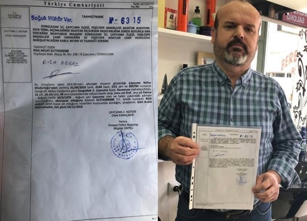Çaycuma ilçesinde berberlik mesleğini 12 yıldan bu yana sürdürmeye devam eden Rıza Akçay isimli esnaf, 31 Mart yerel seçimlerinde Yeşiltepe Mahallesinden muhtar adayı olarak açıkladı. Akçay muhtarlık adaylığını açıkladıktan sonra Çaycuma 2. Noterliğine giderek seçildiği takdirde alacağı muhtarlık maaşını ilçedeki mahallede olan Yeşiltepe Mahallesi Camii Derneğine ve Yeşiltepe Ahlatlar Camii Derneği’ne bağışlayacağını taahhüt ederek noter tasdikli belge aldı.