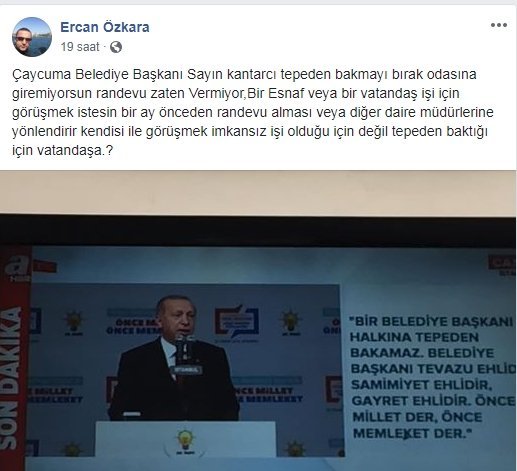 Özkara’nın sosyal medya hesabındaki paylaşımı şu şekilde; “Çaycuma Belediye Başkanı Sayın kantarcı tepeden bakmayı bırak odasına giremiyorsun randevu zaten Vermiyor,Bir Esnaf veya bir vatandaş işi için görüşmek istesin bir ay önceden randevu alması veya diğer daire müdürlerine yönlendirir kendisi ile görüşmek imkansız işi olduğu için değil tepeden baktığı için vatandaşa.?” (Haber Merkezi)