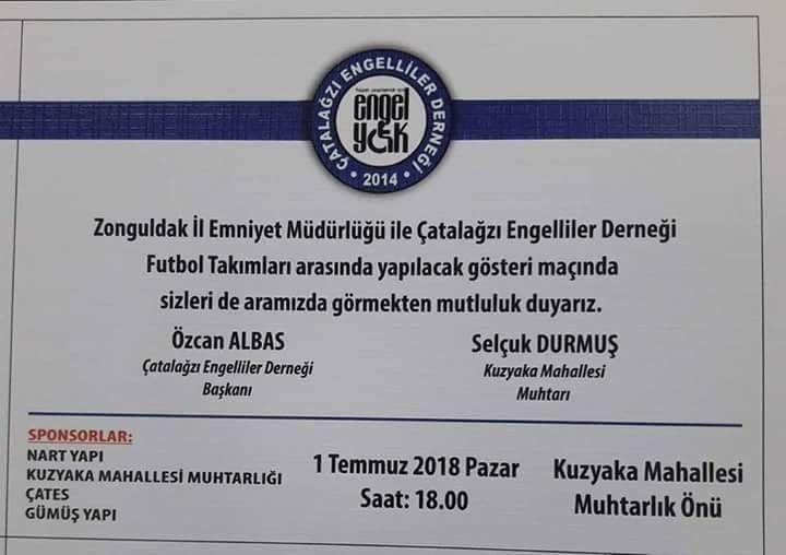Çatalağzı Engelliler Derneği Başkanı Özcan Albas, 1 Temmuz Pazar günü Zonguldak’In Kilimli ilçesine bağlı Çatalağzı Beldesinin Işıkveren Kuzyaka sahasında Zonguldak İl Emniyet Müdürlüğü personeli ve Engelliler ile futbol maçı yapacaklarını belirtti.