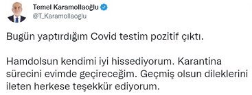 Açıklamada, Karamollaoğlu’nun evinde dinlenerek karantina sürecini geçireceği bilgisi verildi.