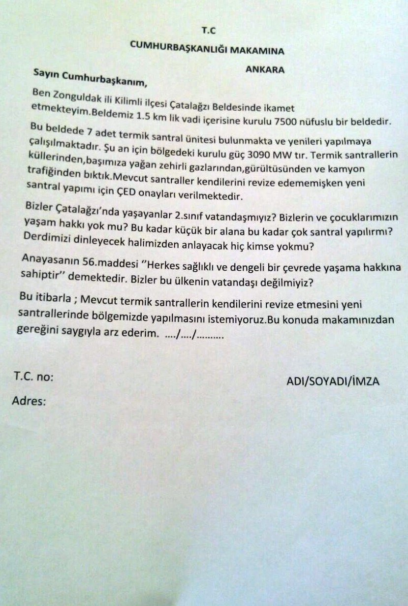 Cumhurbaşkanlığına gönderilmek üzere yazılan dilekçede; belde de 7 adet termik santral ünitesinin bulunduğu, bölgede kurulu olan gücün 3090 MW olduğu, termik santrallerin küllerinden ve zehirli gazlardan, gürültüden ve kamyon trafiğinden halkın çok tepkili olduğu, mevcut santraller kendilerini revize edilememişken yeni santral yapımı için ÇED onaylarının verildiği ibareleri yazıldı.
