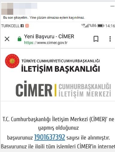 Facebook hesabında paylaştığı durumundan sonra Cumhurbaşkanlığı CİMER sistemine yeniden şikayet dilekçesi ile başvuran A.K., “Bu son şikayetim.. Yine çözüm olmazsa eylem kaçınılmaz.” diye paylaşımda bulundu. (ZONMEDYA / ÖZEL)