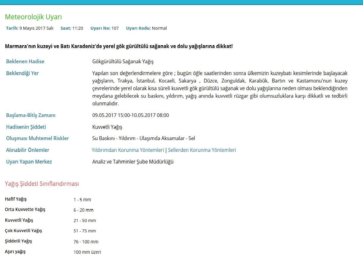 Yapılan son değerlendirmelere göre ; Bugün öğle saatlerinden sonra ülkemizin kuzeybatı kesimlerinde başlayacak yağışların, Trakya, İstanbul, Kocaeli, Sakarya, Düzce, Zonguldak, Karabük, Bartın ve Kastamonu’nun kuzey çevrelerinde yerel olarak kısa süreli kuvvetli gök gürültülü sağanak ve dolu yağışlarına neden olması beklendiğinden meydana gelebilecek su baskını, yıldırım, yağış anında kuvvetli rüzgar gibi olumsuzluklara karşı dikkatli ve tedbirli olunmalıdır. (Haber Merkezi)