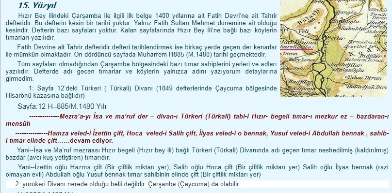 “Hızır Bey ilindeki Çarşamba ile ilgili ilk belge 1400 yıllarına ait Fatih Devri’ne ait Tahrir defteridir. Bu defterin kesin bir tarihi yoktur. Yalnız Fatih Sultan Mehmet dönemine ait olduğu kesindir. Defterin bazı sayfaları yoktur. Kalan sayfalarında Hızır Bey İli’ne bağlı bazı köylerin tımarları yazılıdır.