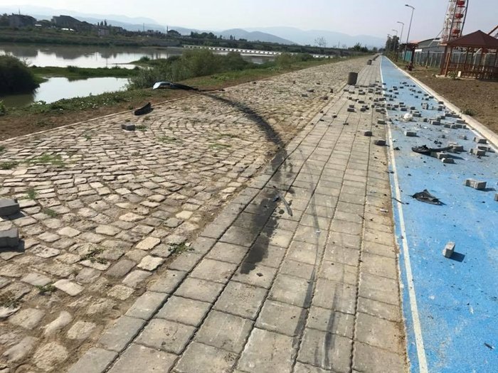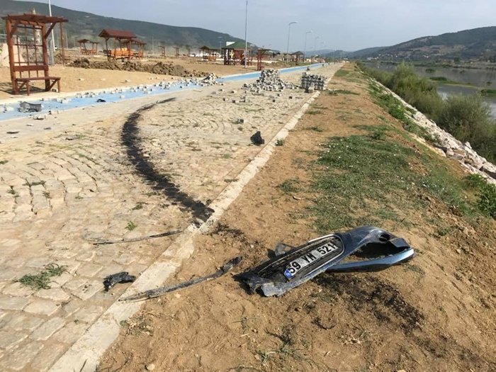 Alınan bilgiye göre, araç trafiğine kapalı olan bölgede, bisiklet ve yaya gezi yolunda aşırı süratle oturma banklarının arasından zikzak yapan 59 YM 521 plakalı araç sürücüsü G.B. (54), önce yolu kapatmak için kullanılan parke paletlerine vurdu ardından Filyos ırmağına uçtu.