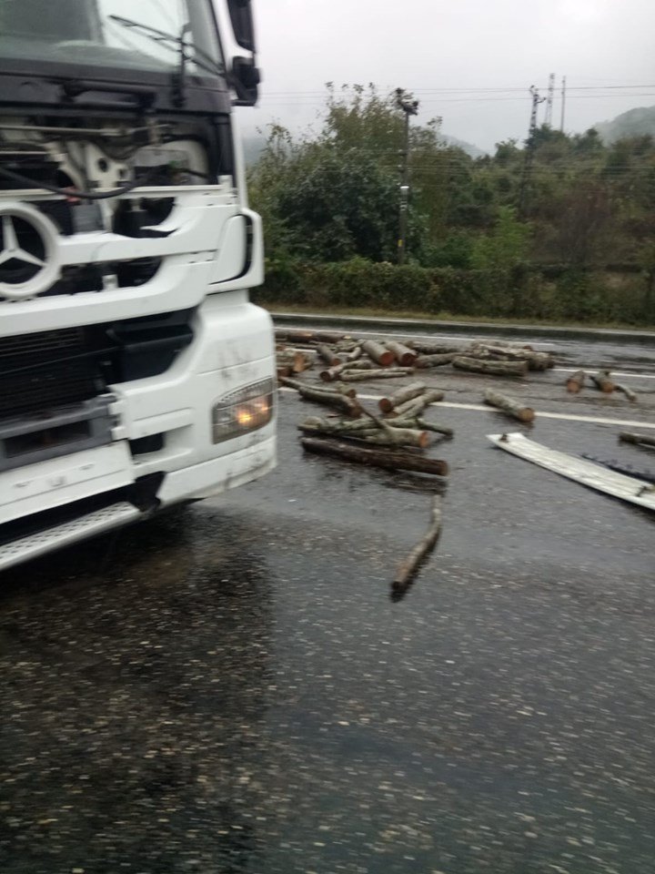 Alınan bilgiye göre havanın aşırı sağanak ve yolun kaygan olması nedeniyle seyir halinde giden 2 TIR zincirleme kaza yaptı. TIR’lardan bir tanesi yoldan çıkarak kanala uçtu. Diğer TIR ise yolda kaldı. TIR’lardan bir tanesine olan tomruk ve odunlar ise yola saçıldı.