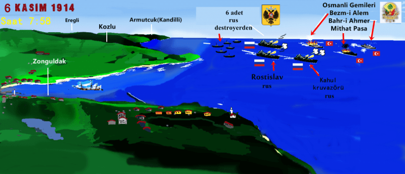 Alman Geobel savaş gemisinin Rusya`da ki şehirleri bombalamasının ardından Rus Gemileri Zonguldak açıklarına gelip Armutcuk(Kandili) Mevkini bomba yağdırmaya başladı.