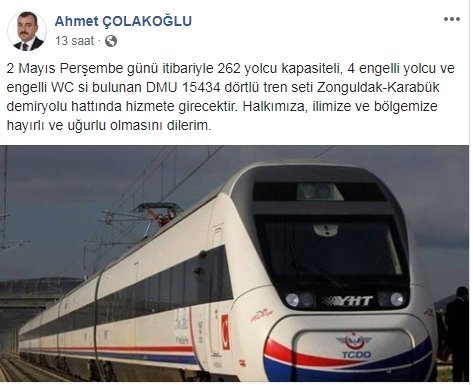 Ak Parti Zonguldak Milletvekili Ahmet Çolakoğlu Zonguldak-Karabük hattına 2 Mayıs 2019 Perşembe gününden itibaren yeni bir 4’lü DMU tren setinin hizmete gireceğini ifade etti.