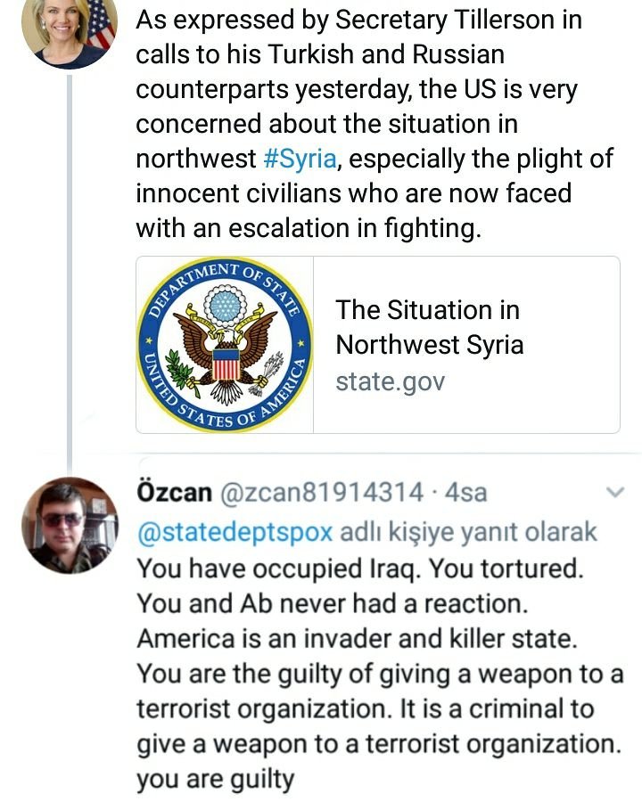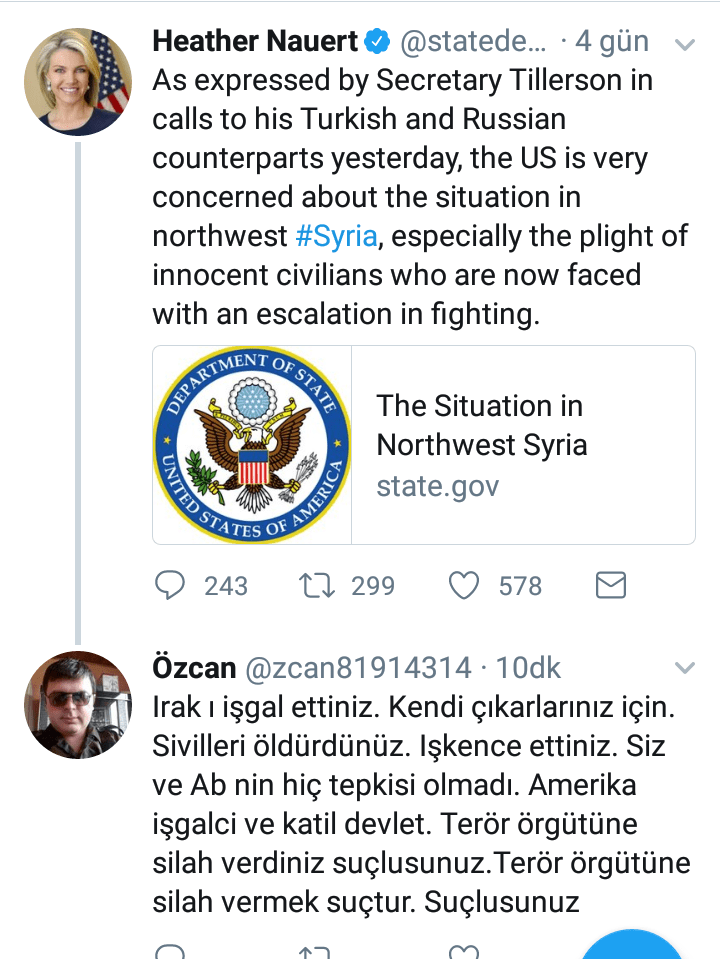 Çatalağzı Engelliler Derneği Başkanı Özcan Albas ABD Dış İlişkiler Bakanlığı Sözcülüğünü yapan Heather Nauert’in sosyal medya hesabı olan twetter’daki bir paylaşımına istinaden öyle bir sert mesaj ile cevap verdi. Albas; “Irak’ı işgal ettiniz. Kendi çıkarlarınız için. Sivilleri öldürdünüz. İşkence ettiniz. Siz ve AB’nin tepkisi olmadı. Amerika işgalci ve katil devlet. Terör örgütüne silah verdiniz. Terör örgütüne silah vermek suçtur. Suçlusunuz” diye yorum yazarak tepkisini dile getirdi.
