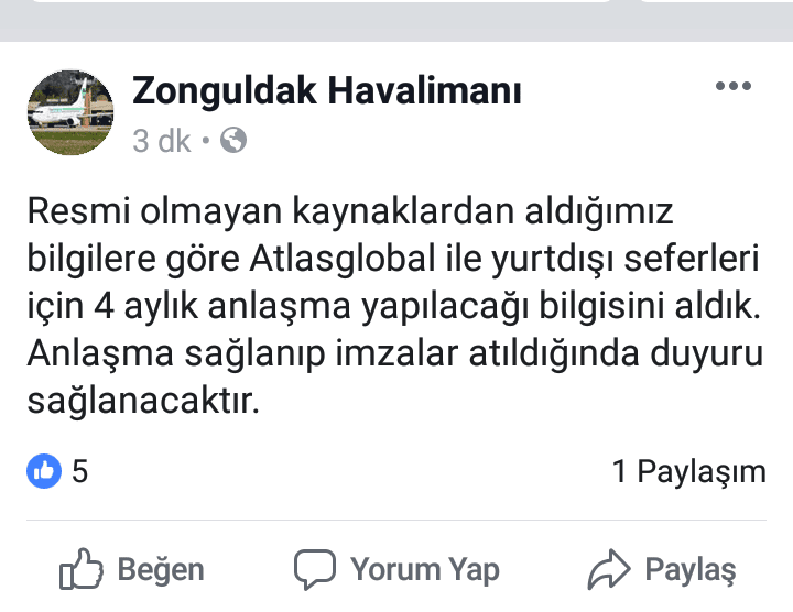 Zonguldak Havalimanı sosyal medya hesabından yapılan açıklamada; “Resmi olmayan kaynaklardan aldığımız bilgilere göre Atlasglobal ile yurtdışı seferleri için 4 aylık anlaşma yapılacağı bilgisini aldık. Anlaşma sağlanıp imzalar atıldığında duyuru sağlanacaktır” denildi. (Haber Merkezi)