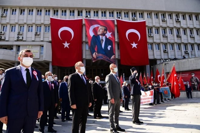 Valilik, Belediye Başkanlığı ve Muharip Gaziler Derneği çelenklerinin Atatürk Anıtı’na sunulmasından sonra saygı duruşunda bulunuldu, İstiklal Marşı’mız hep birlikte okundu. Günün anlam ve önemine dair konuşma Muharip Gaziler Derneği Başkanı Necmettin Cantaş tarafından yapıldı.
