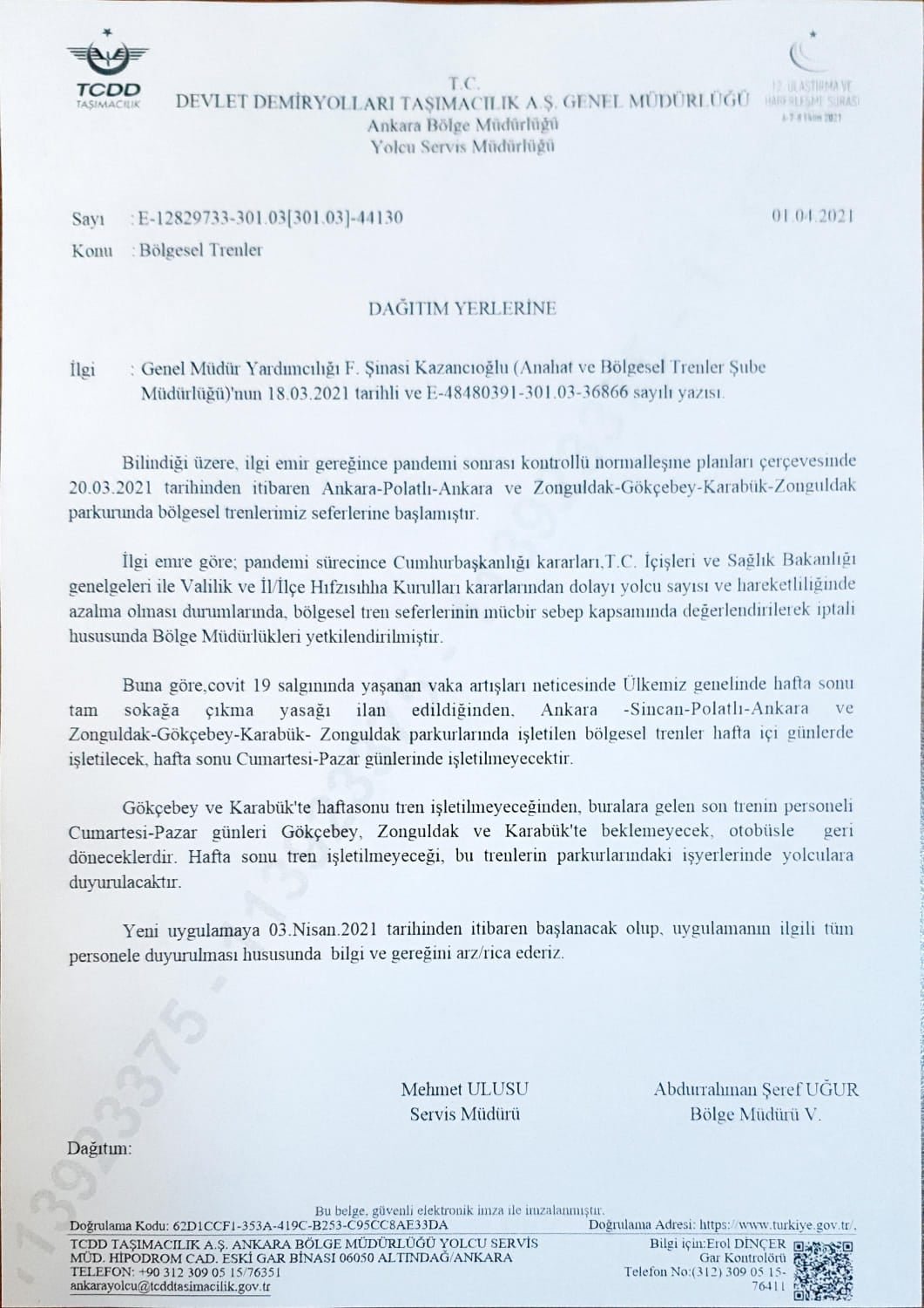 Yeni oluşan pandemi kuralları kapsamında hafta sonu tam sokağa çıkma yasağı uygulacak olması nedeniyle, 3 Nisan’dan itibaren ikinci bir bildiriye kadar Cumartesi ve Pazar günleri yapılacak Zonguldak – Gökçebey – Karbük arasında hizmet veren yolcu tren seferleri kaldırılmıştır.